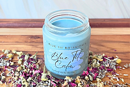 Blue Tit Calm is a soothing, skin-loving body butter crafted to comfort sensitive or reactive skin. Featuring Blue Tansy, our signature calming essential oil, and the Botanical Bloom Trio—rose, chamomile, and calendula—this velvety blend melts into the skin to deliver lasting moisture without a greasy finish. Rich in plant-based nourishment, it helps calm visible redness, soften dry areas, and support all-over skin balance.